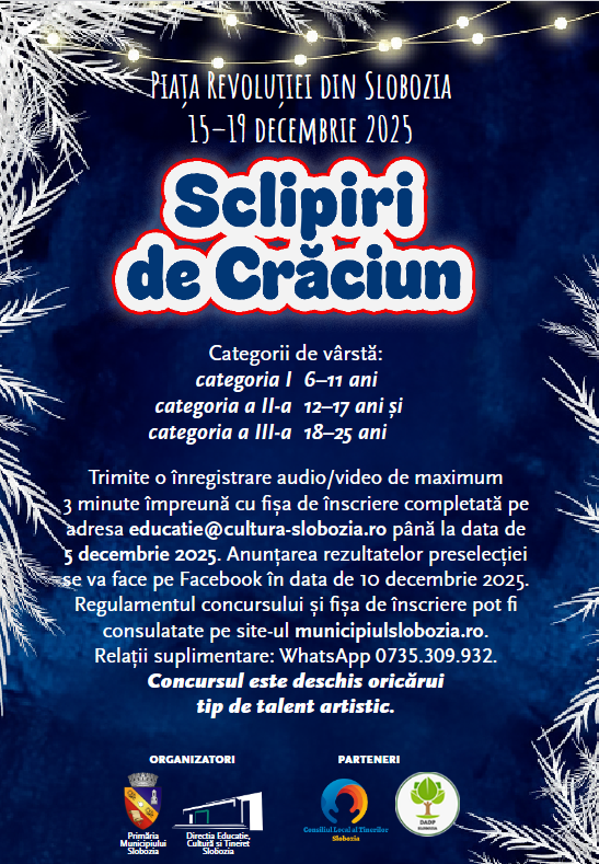 Prezentul Regulament se aplică pentru concursul “Sclipiri de Crăciun” organizat de Primăria Municipiului Slobozia prin Direcția Educație, Cultură și Tineret Slobozia, denumit în continuare Organizator. Organizatorul își rezervă dreptul de a modifica oricând acest regulament, fără o înștiințare prealabilă a participanților, iar orice modificare fiind publicată în forma actualizată a Regulamentului.